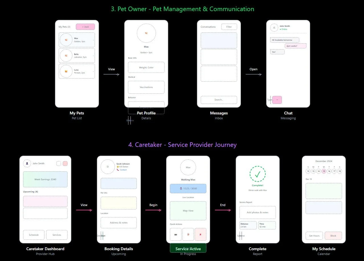 I identified two key directions for the app: one focused on pet owners, and the other on caretakers and trainers. To design a meaningful experience, I made sure to address both sides—crafting intuitive flows, features, and value for each user group throughout the product journey.