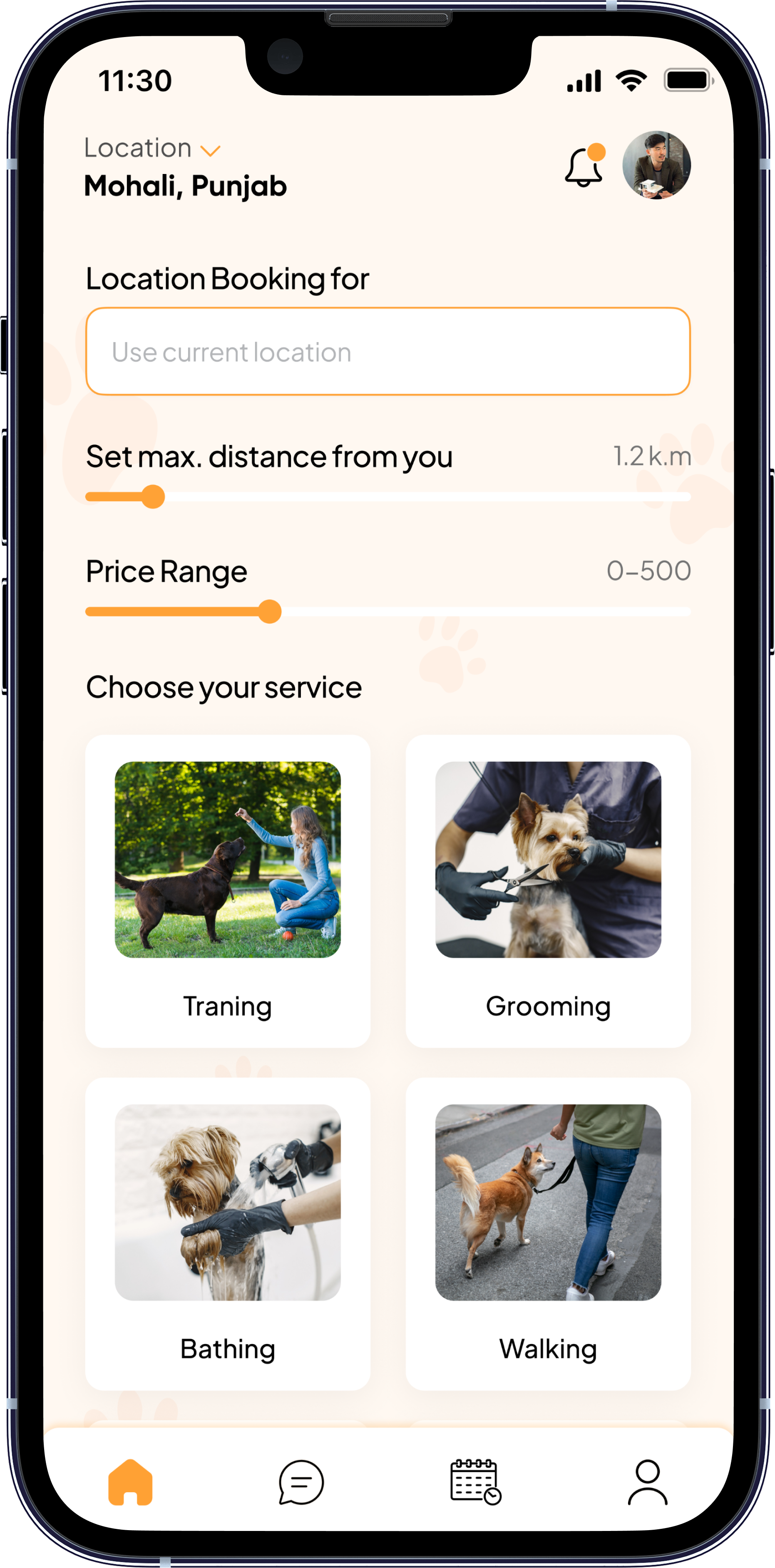 Service selection options like training, walking, grooming, and day care
