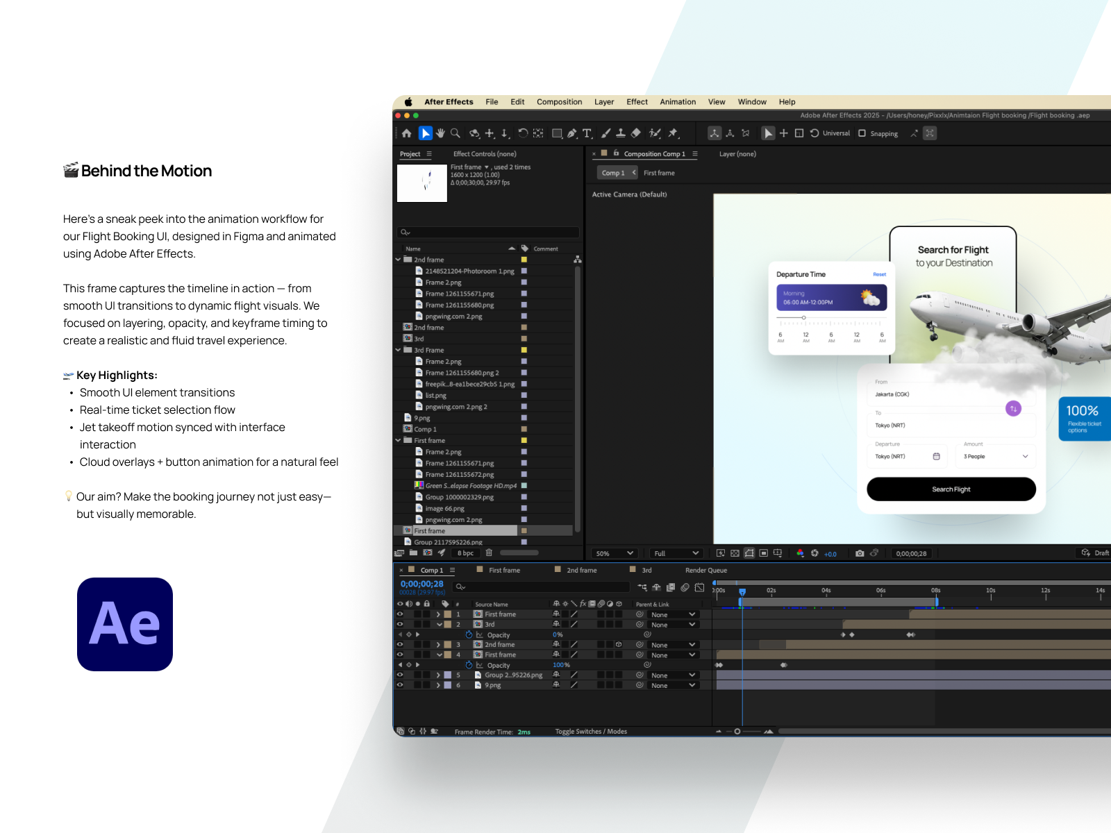An immersive flight booking experience designed in Figma, animated in After Effects, and refined in Adobe Premiere. This motion study captures the full booking journey—from destination selection to seat confirmation—through fluid transitions and a vibrant, intuitive interface.
